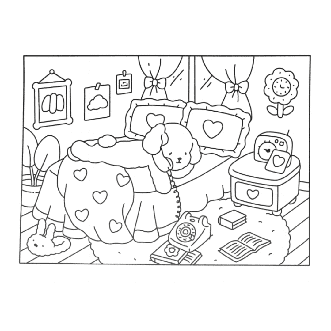 Bobbie goods para imprimir pdf grátis Brasil completo Uszon Emran Ahmed: cachorrinha big head coberta de corações dormindo, ursinho no chão, telefone antigo, rádio coração, livros abertos e relógio flor na parede. Quadro nuvem e planta – desenho bobbie goods original para imprimir A4 limpo, ideal bobbie goods para colorir e imprimir pinterest.
