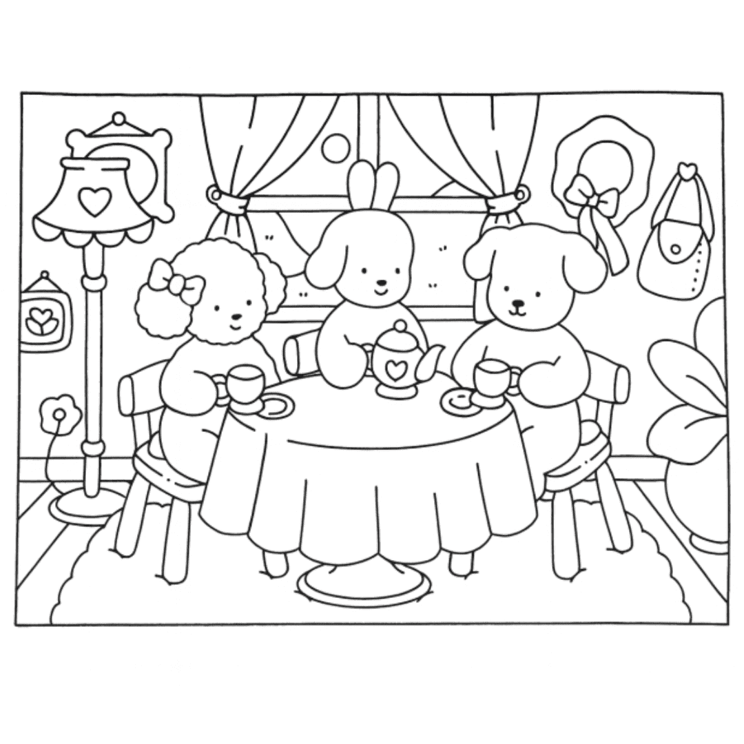 Desenho Bobbie Goods original para imprimir e colorir: coelhinho-cachorro servindo chá, poodle de laço e golden sorrindo à mesa redonda com xícaras, bule coração, lampião e bolsas na parede. Janela com cortinas e lua – estilo big head kawaii 100% tarde elegante.