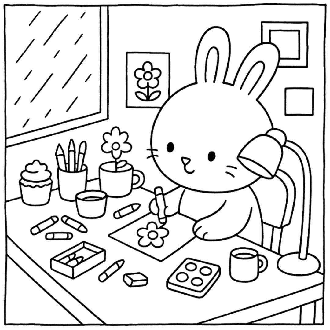 Desenho Bobbie Goods original para imprimir e colorir: coelhinho fofo desenhando flor gigante com giz de cera, mesa lotada de cupcake, café, lápis, tinta e luminária. Janela chuvosa e quadros na parede – estilo big head kawaii 100% inspiração artística.