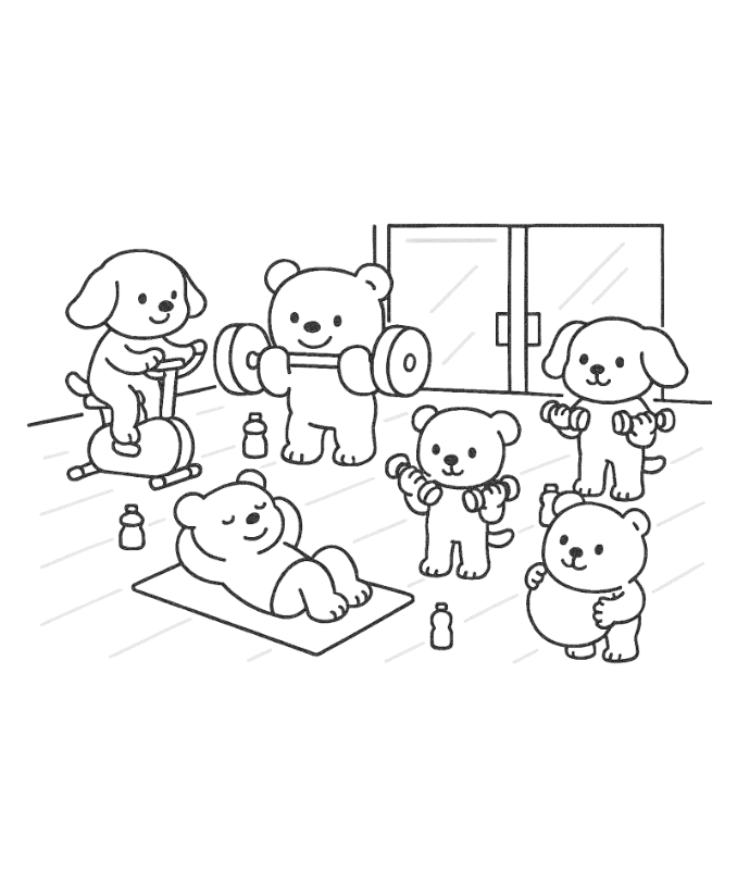 Bobbie Goods Academia: Ursinhos e Cachorrinhos Malhando e Fazendo Exercícios – Desenho Grátis