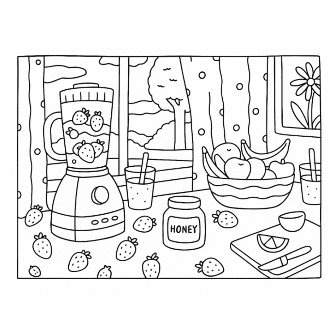 Bobbie Goods Para Imprimir pdf grátis Brasil completo Uszon Emran Ahmed: liquidificador cheio de morangos, pote “HONEY”, copo com canudo, cesta de banana e laranja na janela ensolarada. Cozinha saudável – desenho bobbie goods original para imprimir A4 limpo, perfeito bobbie goods para colorir e imprimir pinterest.