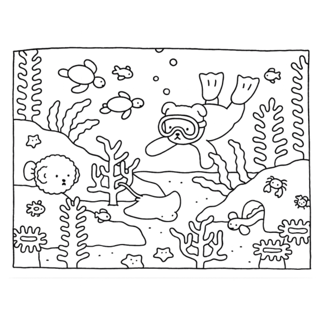 Desenho Bobbie Goods original para imprimir e colorir: ursinho big head de máscara explorando fundo do mar, rodeado de tartarugas, peixinhos, caranguejo, estrela-do-mar e corais fofos. Bolhas e algas completam a cena – estilo kawaii 100% aventura oceânica.
