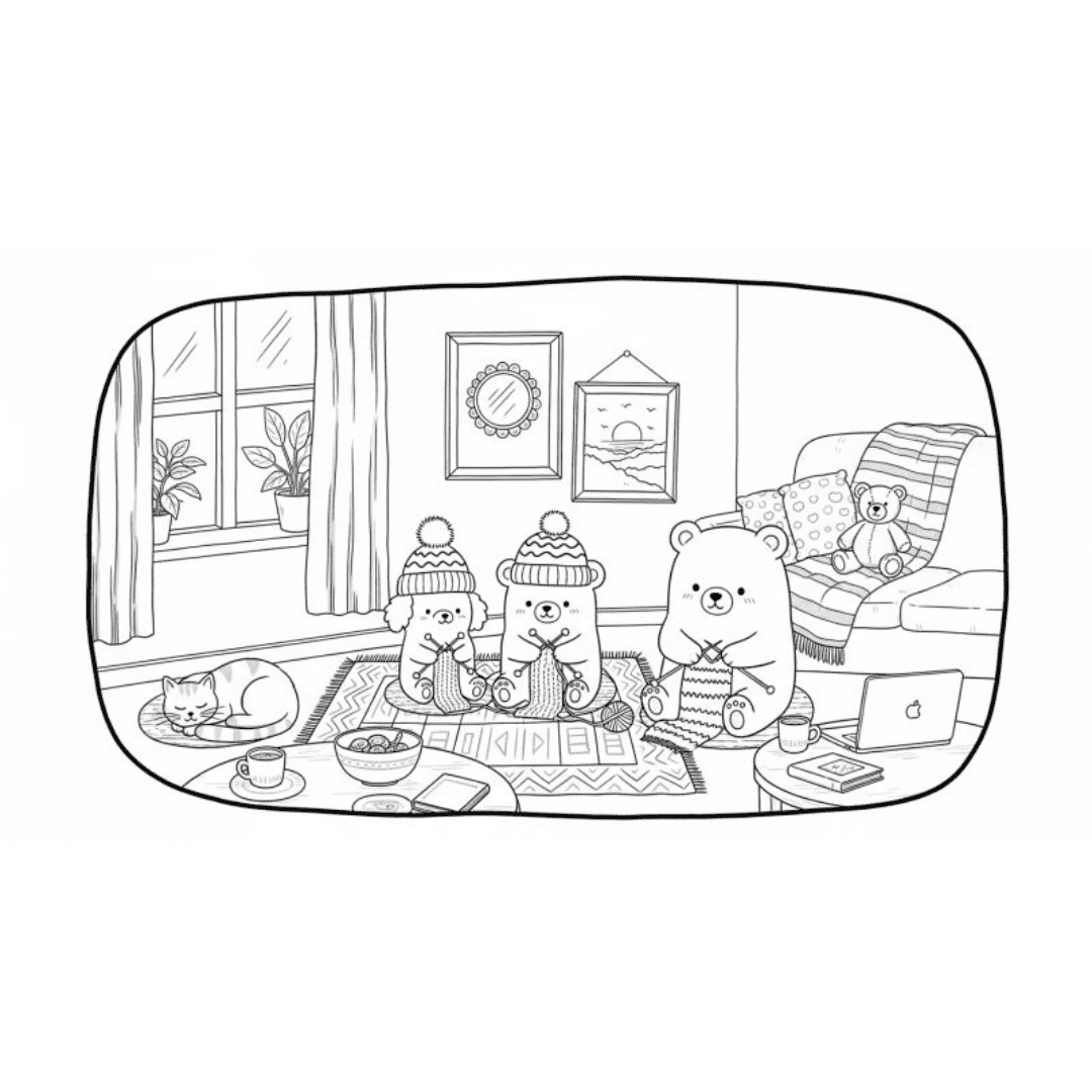 Bobbie goods para imprimir pdf grátis Brasil completo Uszon Emran Ahmed: três ursinhos big head de gorro tricotando cachecóis, gatinho dormindo no puff, xícara quente, laptop coração e ursão no sofá. Janela com plantas e quadro sol – desenho bobbie goods original para imprimir A4 limpo, perfeito bobbie goods para colorir e imprimir pinterest.
