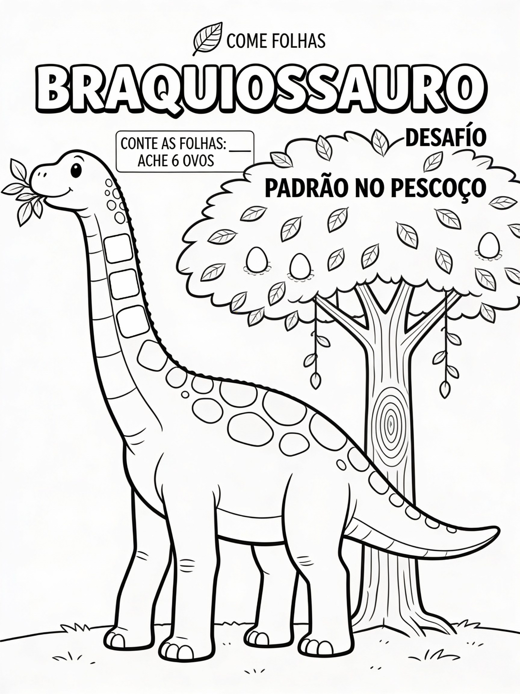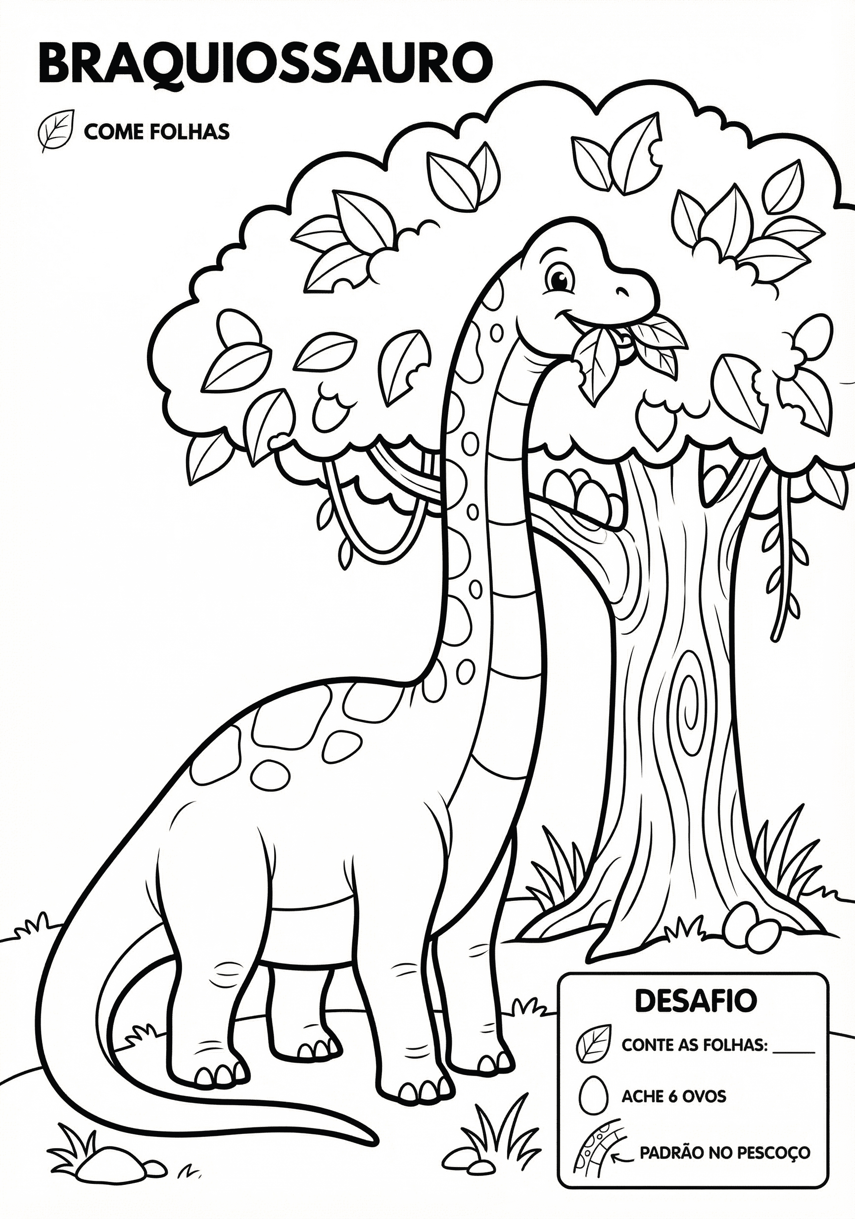 Concentração prolongada: Um desenho de braquiossauro comendo, com suas árvores, folhas e detalhes anatômicos, pode manter uma criança concentrada por 30-45 minutos. Este é um tempo excelente de foco para crianças de 5-10 anos, habilidade essencial para o desempenho escolar.