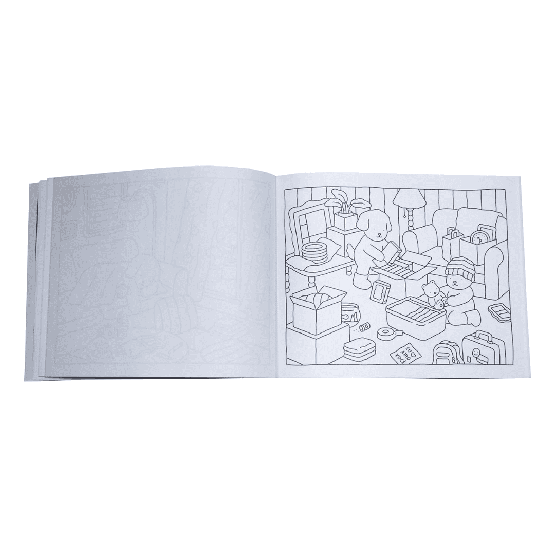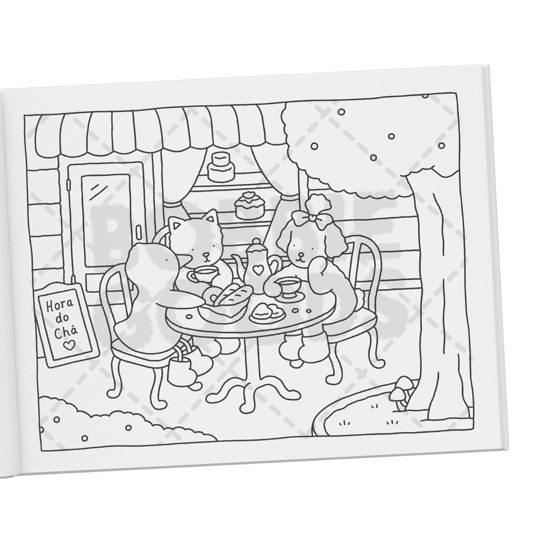 Algumas páginas trazem cenários externos cheios de natureza e liberdade. Outras apresentam ambientes internos aconchegantes e reconfortantes. Essa variedade permite colorir conforme seu humor do momento.