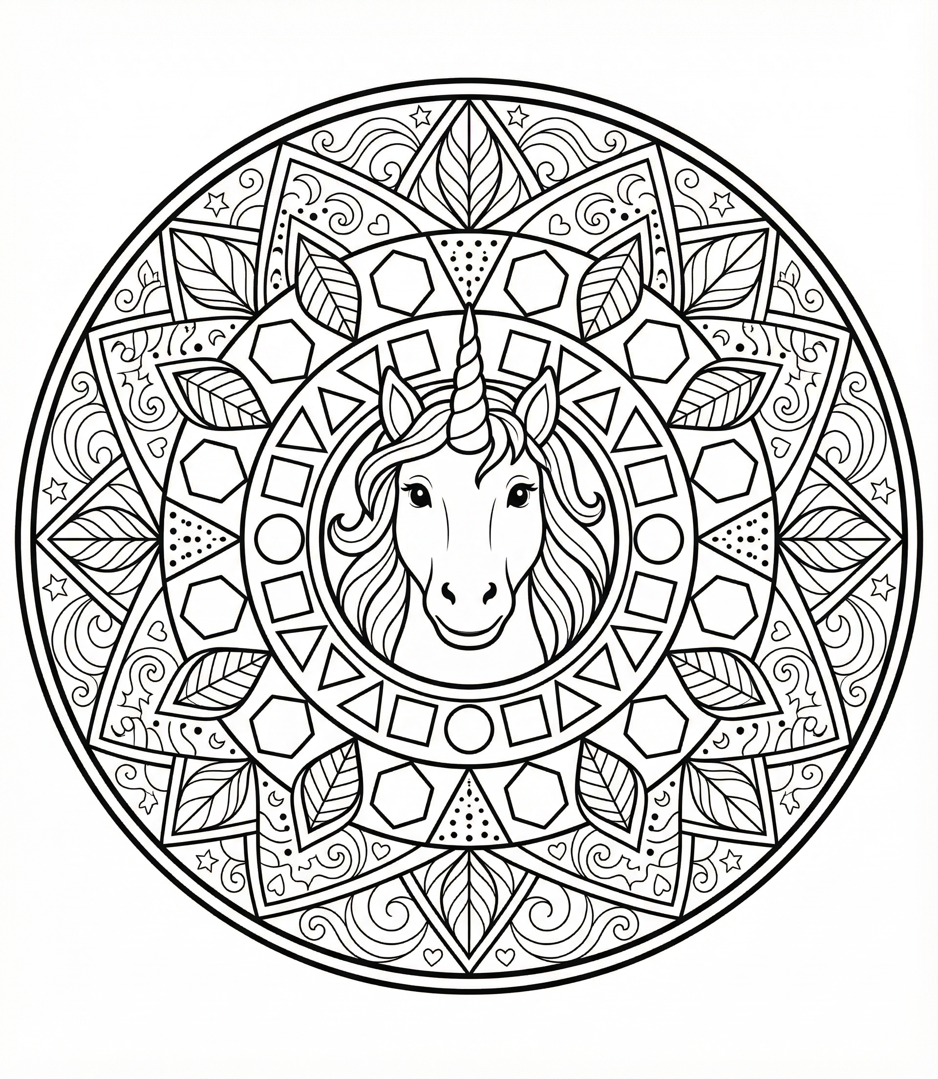 Para os amantes de desafios artísticos, nossa coleção de mandalas detalhadas oferece designs intrincados que proporcionam horas de concentração e satisfação. Cada mandala unicornio desta categoria foi criada com: