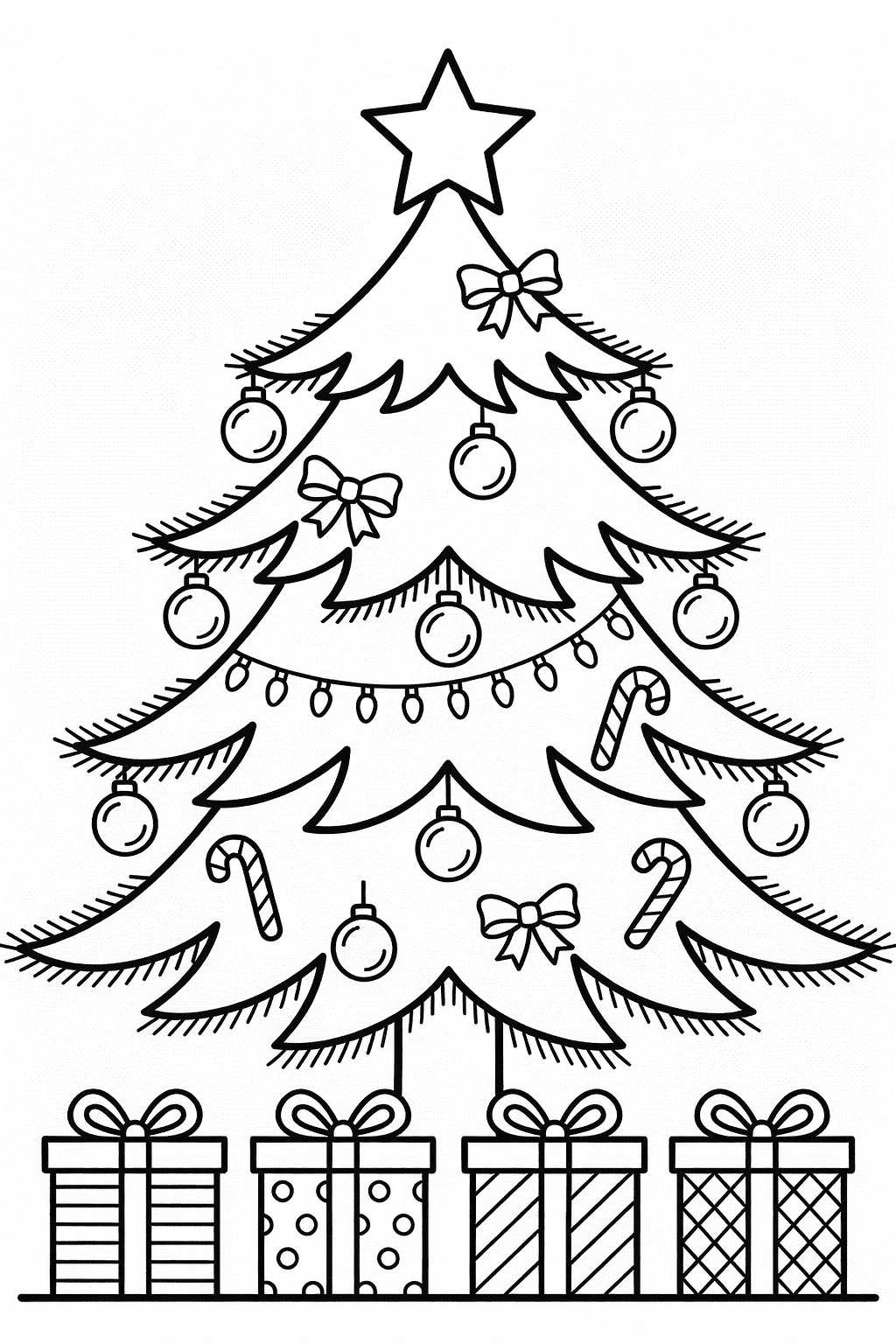 - Árvore com guirlandas, sinos e presentes embaixo — rica em elementos natalinos para colorir