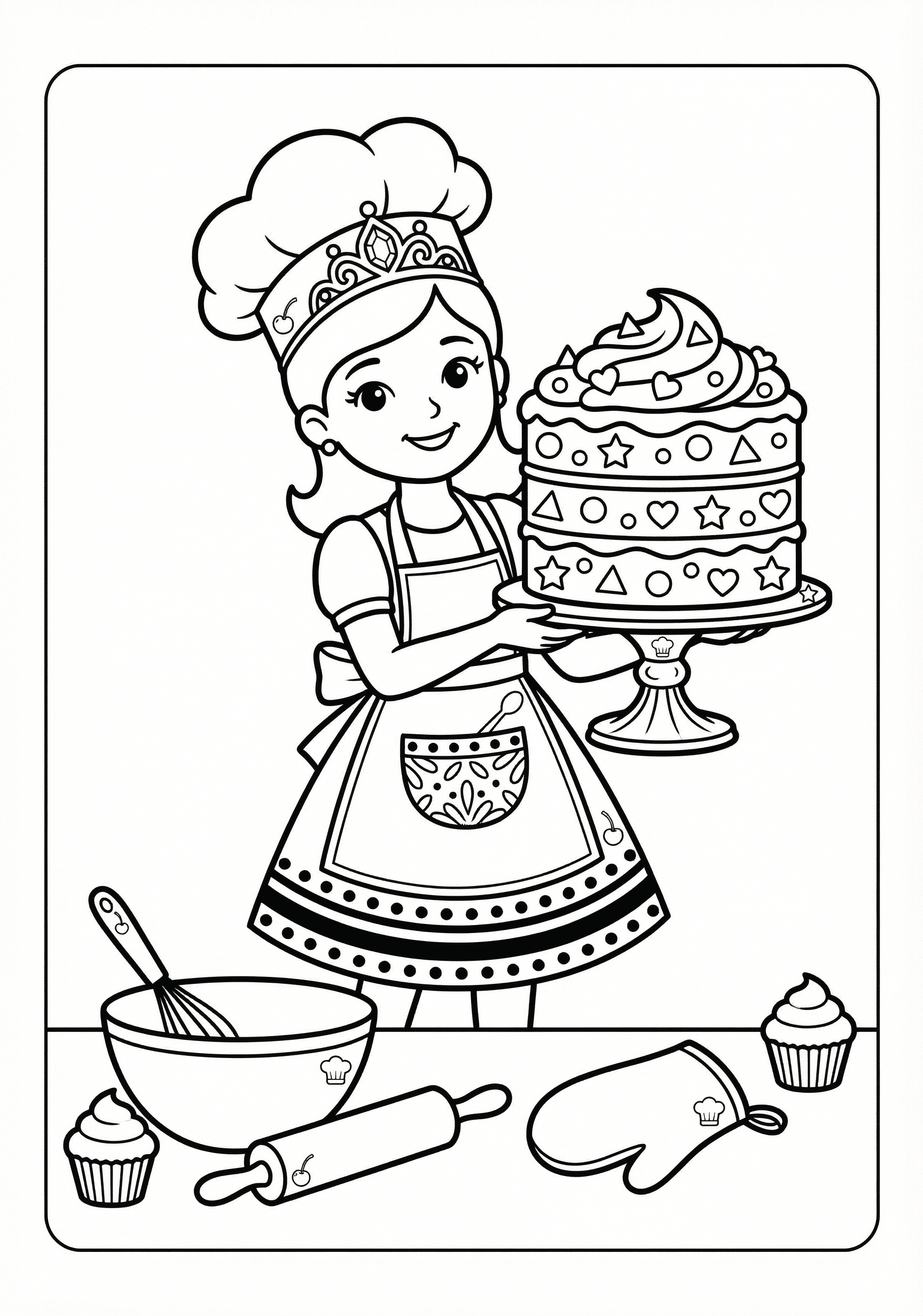 Baixe GRÁTIS mais de 50 desenhos de princesa chef para colorir! Páginas para imprimir com princesas na cozinha, acessórios de chef e cenários encantadores. Perfeito para crianças!