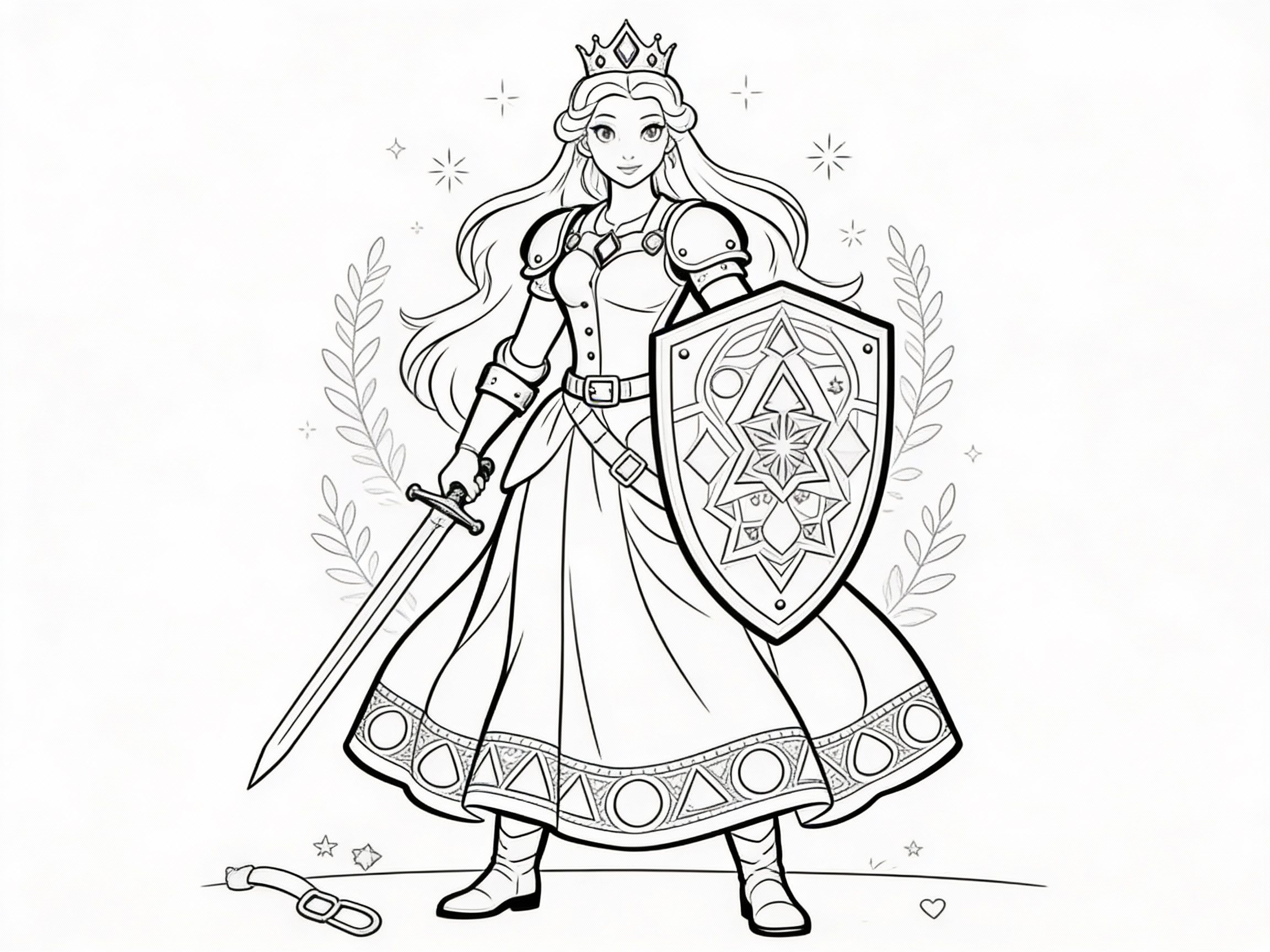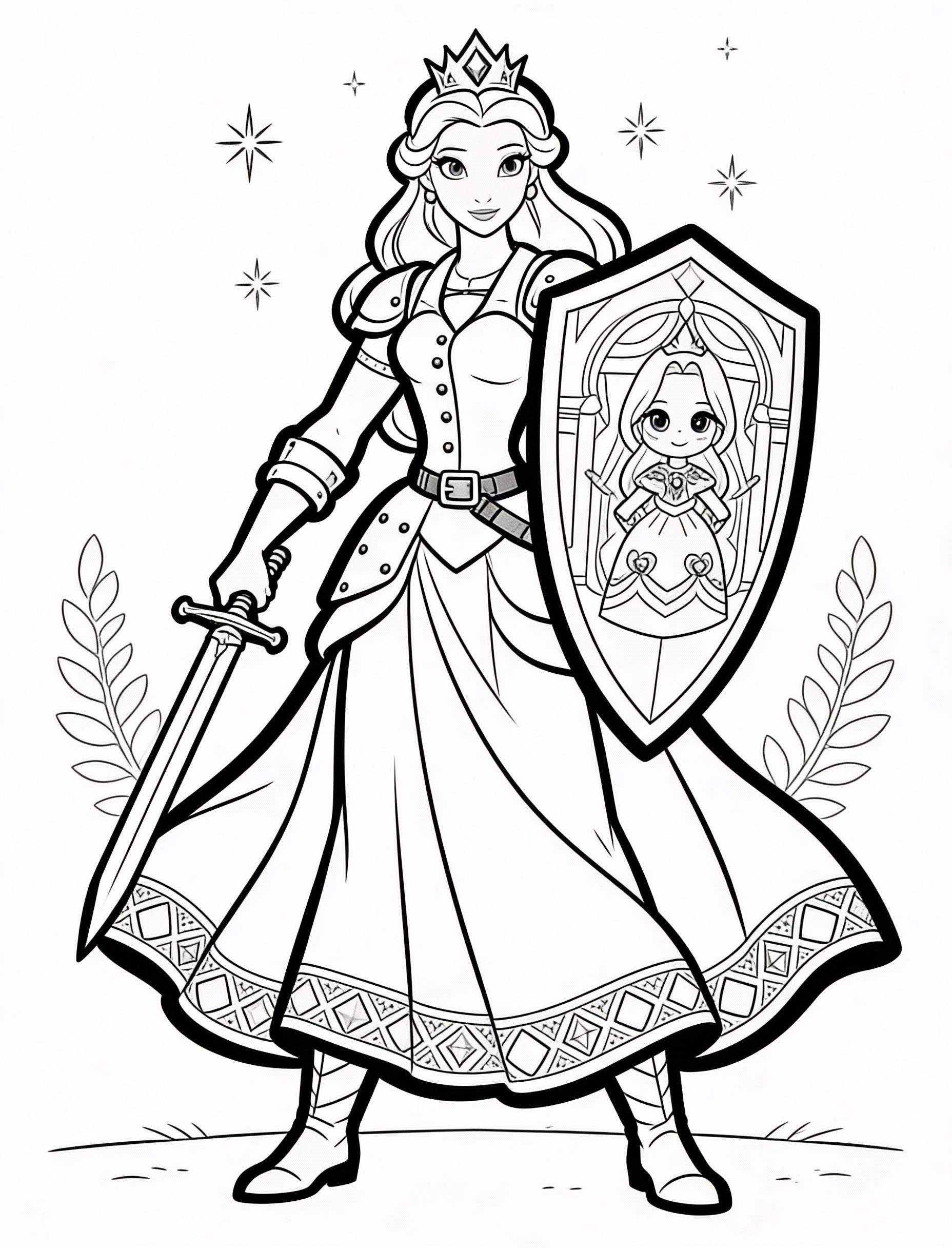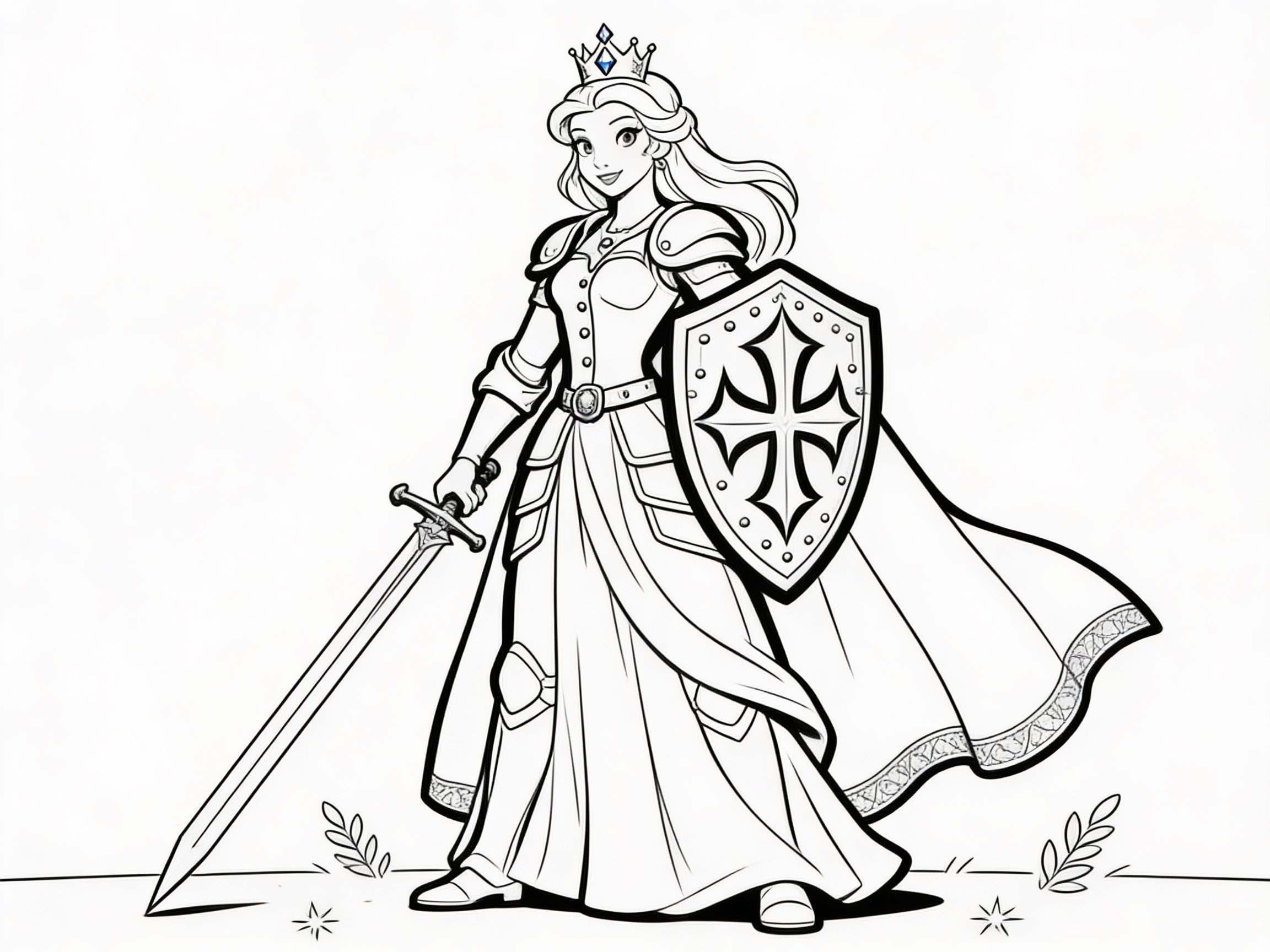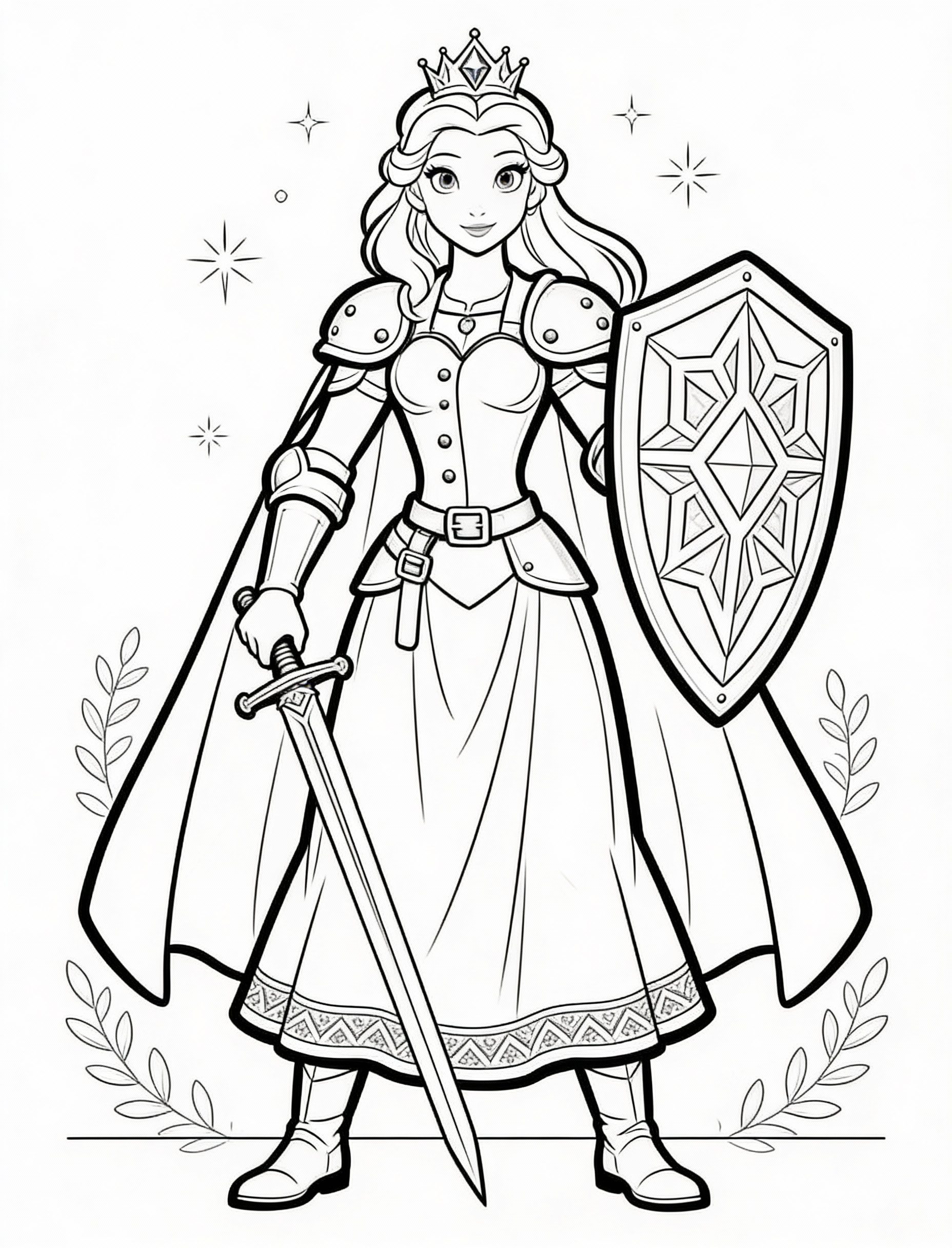 Baixe grátis desenhos de Princesa Guerreira para colorir! Desenhos inspiradores com espada, coroa e símbolos de fé. Perfeitos para crianças que amam Deus e aventura. Imprima agora!